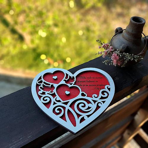 Čestitka za poroko. Kombinacija les in karton različnih barv.
