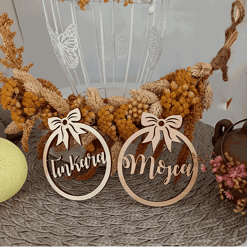 Lesena bunkica/okrasek za novoletno smrekco/jelko velikosti 8-9 cm. Okrasek je narejen iz dveh delov. Na podlagi je ime ali misel, zgornji del pa je barven. Na voljo trije različni motivi.