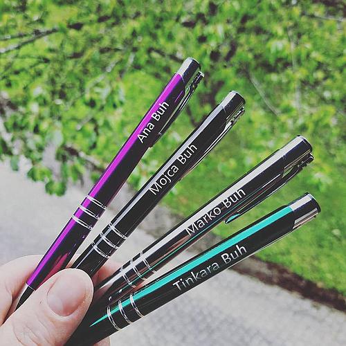 Cena se spremeni s količino. Cena kemičnega svinčnika in gravure do 10 kos je 1,50 €7kos, od 11 do 200 kos je 0,75 €/kos, od 201 do 500 kos je cena 0,68 €/kos, od 501 do 800 kos je cena 0,65 €/kos, od 801 do 1000 kos je cena 0,60 €/kos.