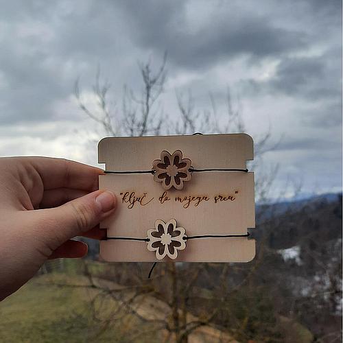 Zapestnica v obliki dveh src. Izbirate lahko med več oblikami - prazna srčka, gravirana srčka. Les, pleksi zlat ali zrcalo. Obesek na zapestnici je lahko na tanki elastični vrvici na zateg, prepleteni vrvici na zateg ali vrvici za pripenjanje. Zapestnica je na leseni ploščici s posvetilom.
